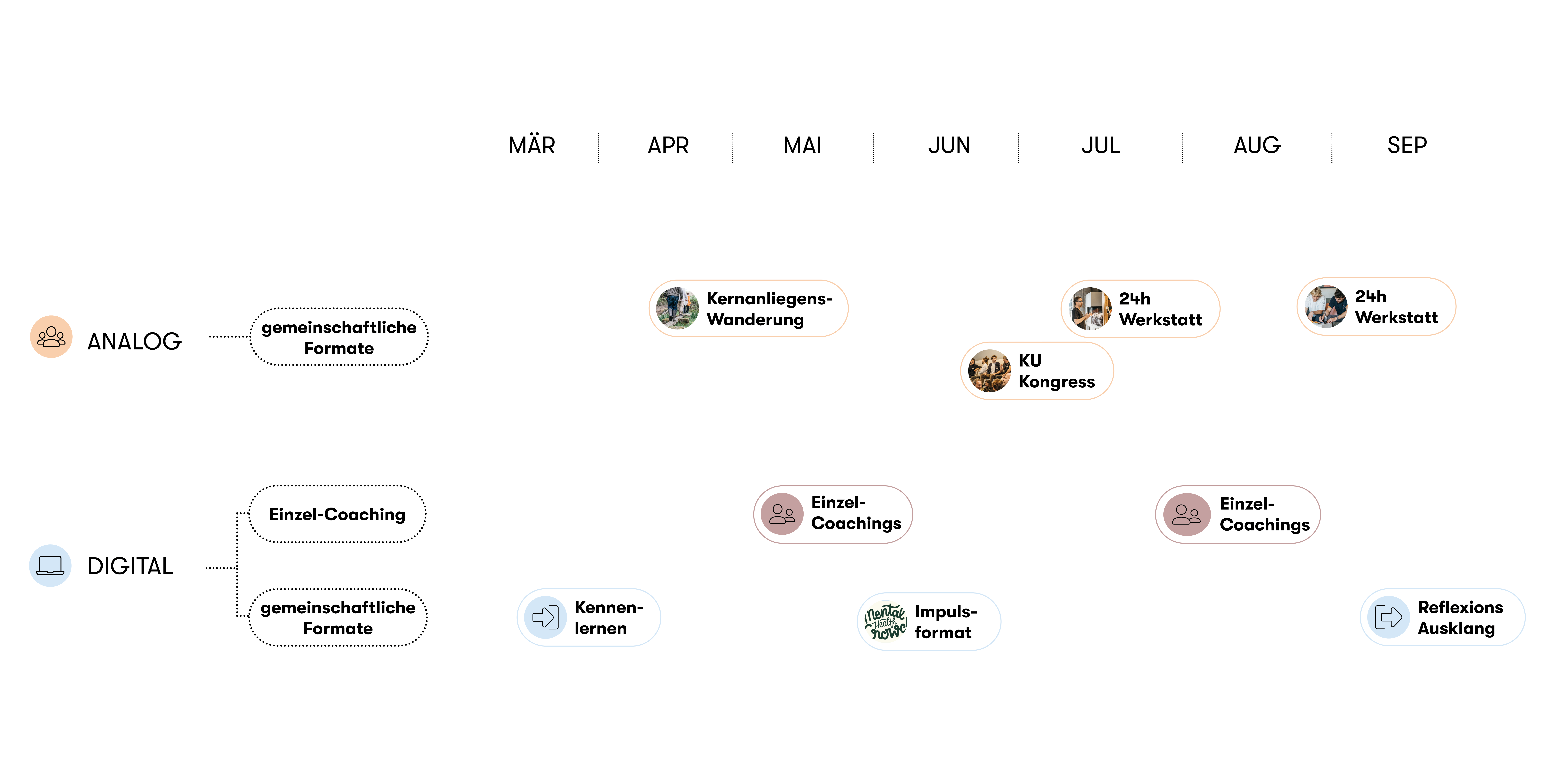 Das Programm lässt sich flexibel in Deinen Alltag integrieren und kombiniert analoge und digitale Workshops, Coaching-, Impuls- und Austauschformate.